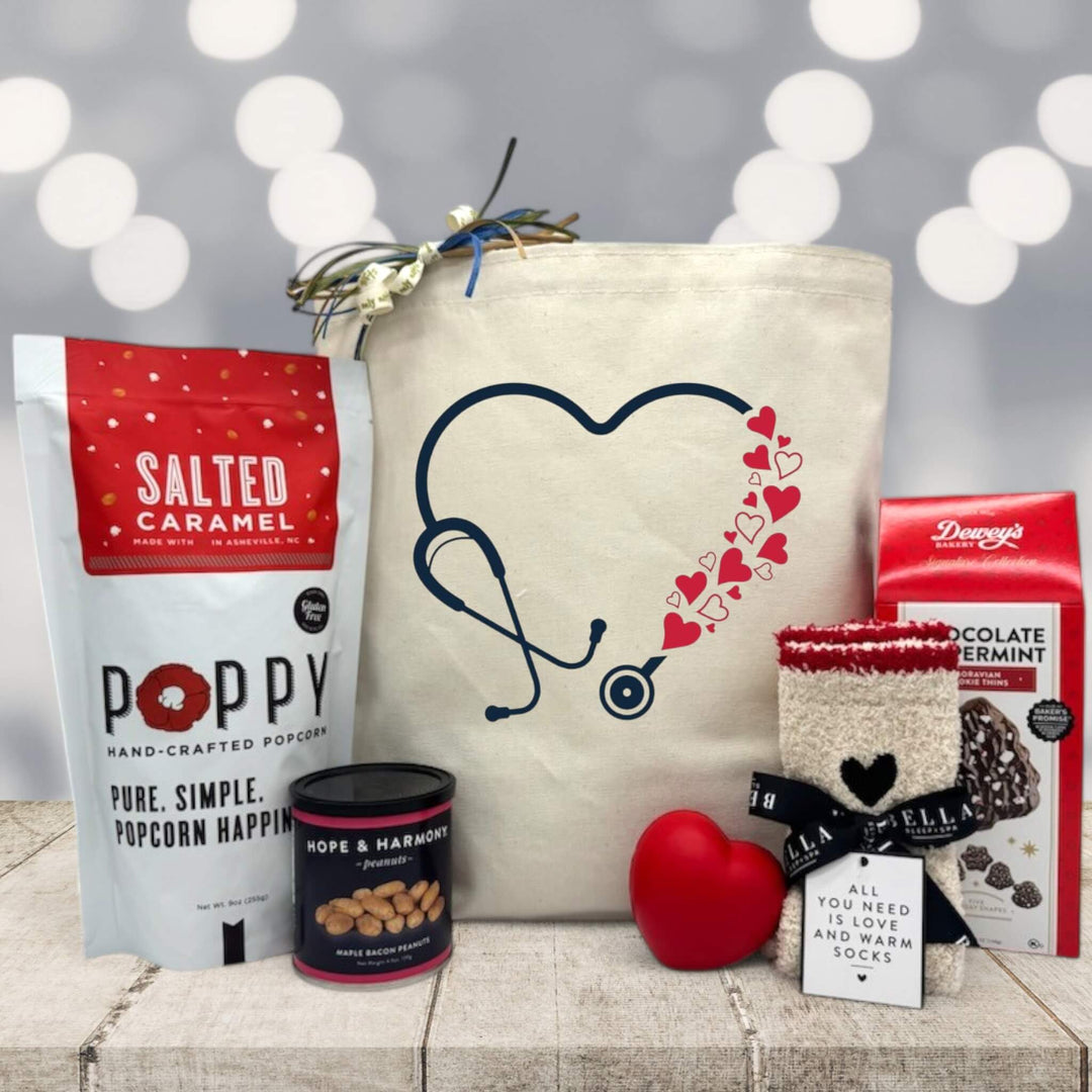 Show your gratitude in the most heartfelt way with this charming gift basket designed for all healthcare staff who put their hearts into everything they do. Packed in a reusable tote featuring an adorable stethoscope and heart design, this bundle is filled with comfort, flavor, and a little fun—just like your favorite nurse.
